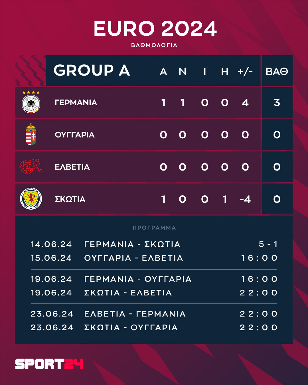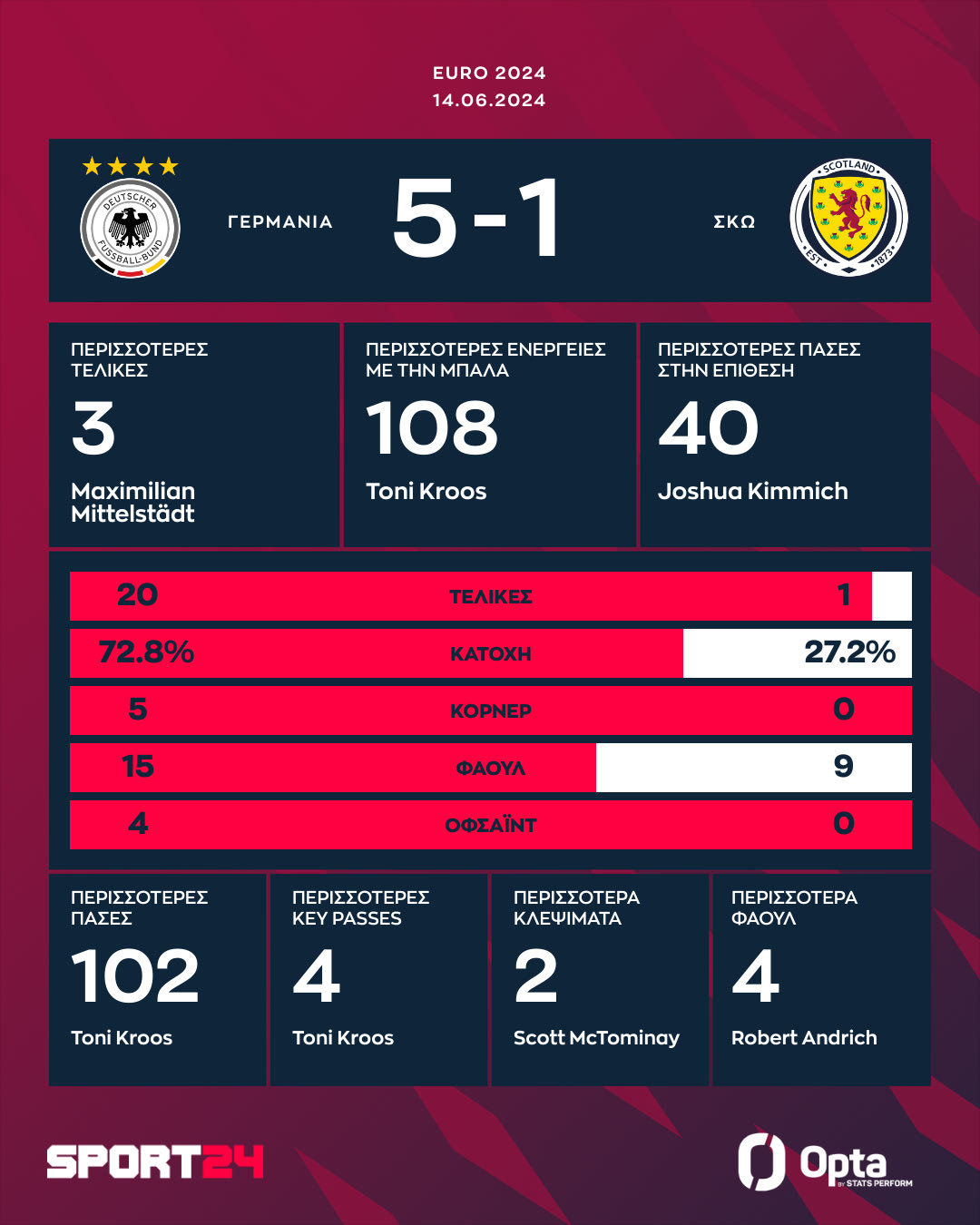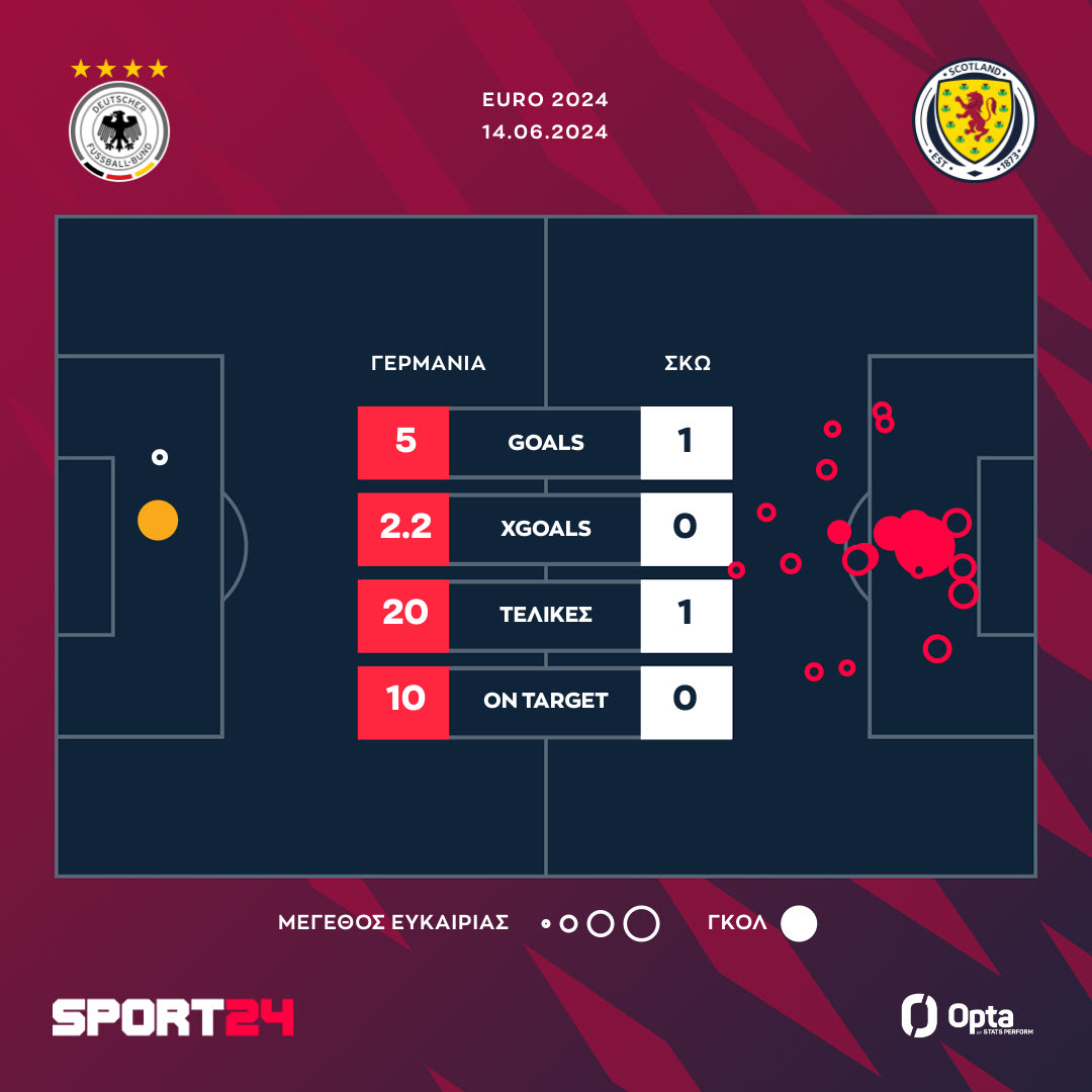 Καταιγιστική η Γερμανία, μπήκε με το δεξί στο Euro 2024, επικρατώντας 5-1 της Σκωτίας, η οποία αγωνιζόταν με δέκα παίκτες για ένα ημίχρονο. Βιρτς (10'), Μουσιάλα (19'), Χάβερτς (45+1'), Φίλκρουγκ (68') και Τζαν (90+3') τα γκολ των Γερμανών. Αυτογκόλ του Ρίντιγκερ στο 87'.