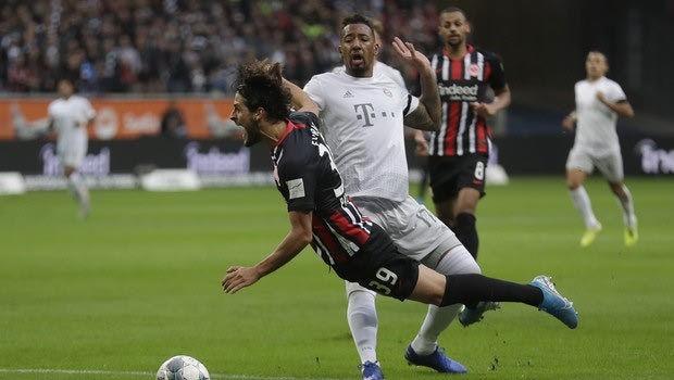 Frankfurt's Goncalo Paciencia is fouled by Bayern's Jerome Boateng, who was shown a yellow card for the tackle and a penalty was given during a German Bundesliga soccer match between Eintracht Frankfurt and Bayern Munich in the Commerzbank Arena in Frankfurt, Germany, Saturday, Nov. 2, 2019. (AP Photo/Michael Probst)