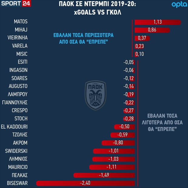 Όμως δεν κάνουν διαφορά: Μάτος, Μιχάι, Βιεϊρίνια και Βαρέλα έβαλαν μαζί πέντε γκολ. Το δράμα για τον ΠΑΟΚ είναι στο κάτω μέρος του γραφήματος. Στο -2.40 ο Μπίσεσβαρ, στο -1.49 ο Πέλκας, στο -1 Σβιντέρσκι, Λημνιός και Μαουρίσιο. Αν τις δεις μεμονωμένα δεν είναι τραγικές επιδόσεις, ειδικά αυτές του -1. Με ένα καλύτερο τελείωμα θα ήταν στα ίσια.