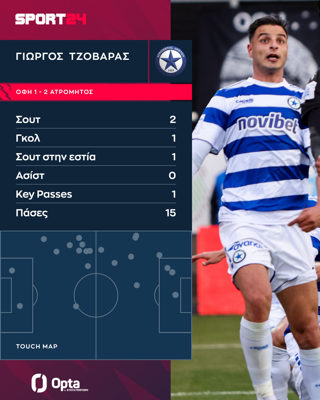 Κόντρα στον Λεβαδειακό δραστηριοπιούταν κατά κύριο λόγο στη μεσαία γραμμή, ενώ το ίδιο συνέβη και εναντίον του ΟΦΗ. Κόντρα στον Παναθηναϊκό – για το πρωτάθλημα – ο νεαρός αγωνιζόταν περισσότερο ως εξτρέμ. Αν δει κανείς το heat map του Τζοβάρα από την αρχή της σεζόν μέχρι σήμερα, είναι πολύ εύκολο να αναρωτηθεί που παίζει. Ο Έλληνας παίκτης έχει αναλάβει ρόλο αριστερού μπακ, αριστερού μέσου, αριστερού εξτρέμ, δεύτερου επιθετικού, ακόμα και ενίοτε αυτόν του φορ.