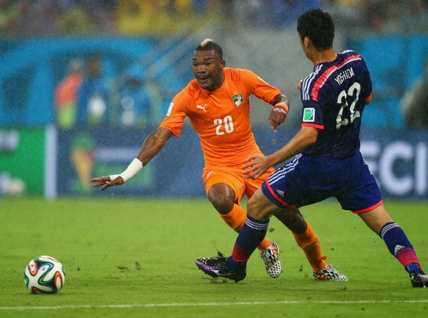 RECIFE, BRAZIL - JUNE 14: Die Serey of the Ivory Coast controls the ball against Maya Yoshida of Japan during the 2014 FIFA World Cup Brazil Group C match between the Ivory Coast and Japan at Arena Pernambuco on June 14, 2014 in Recife, Brazil. (Photo by Clive Rose/Getty Images)