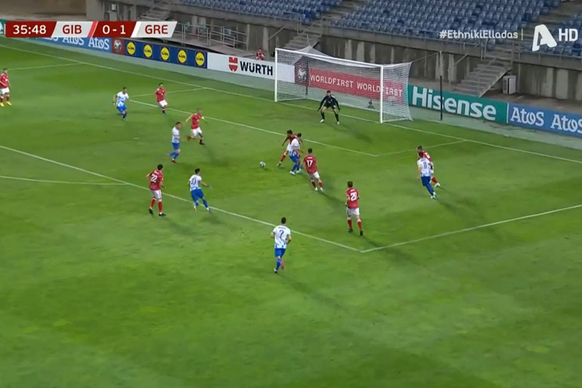 Μια απίστευτη φάση έφτιαξαν οι Έλληνες διεθνείς στο 36′ της αναμέτρησης με το Γιβραλτάρ με τον Πέλκα που ήταν ο τελικός αποδέκτης της μπάλας να είναι άτυχος καθώς το σουτ που πέτυχε από το ύψος του πέναλτι βρήκε το οριζόντιο δοκάρι.