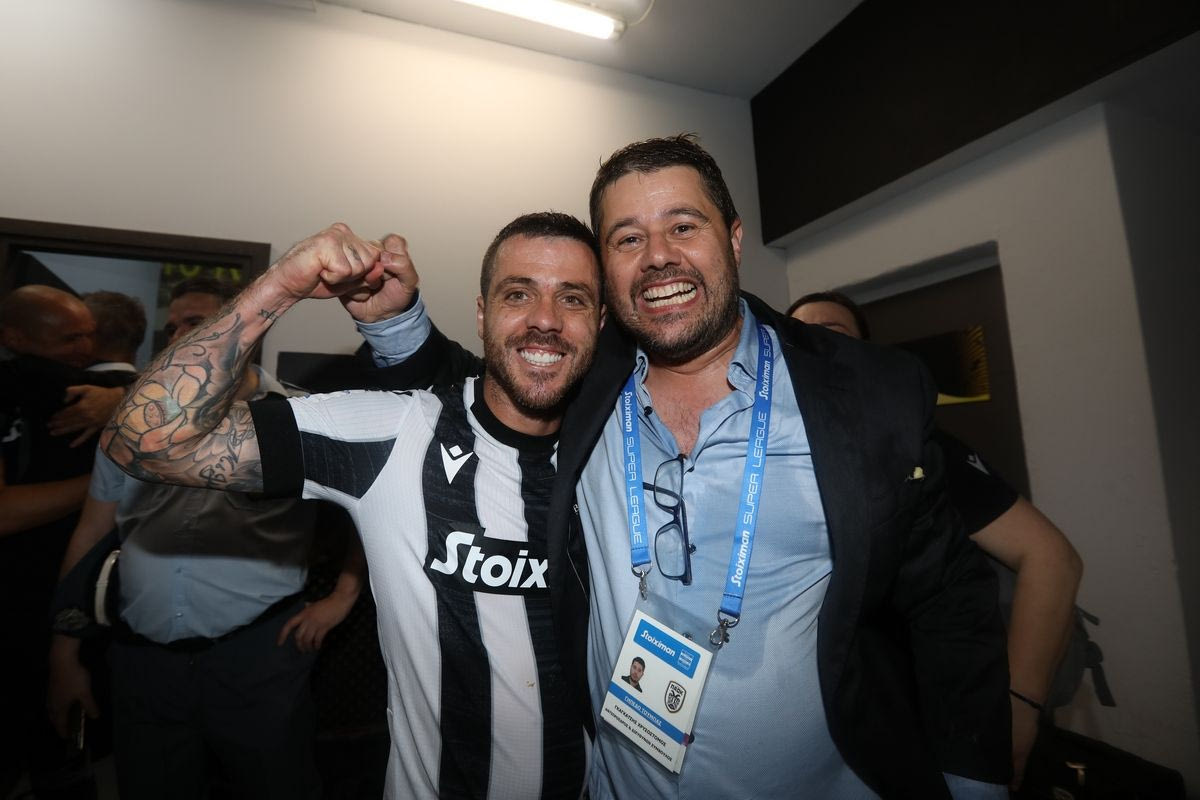 Ο αντιπρόεδρος του ΠΑΟΚ, Μάκης Γκαγκάτσης, πανηγυρίζει μαζί με τον Βιεϊρίνια Eurokinissi Sports