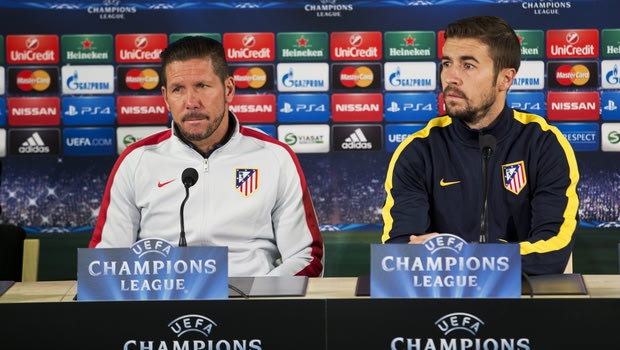 Atletico Madrid coach Diego Simeone and player Gabi, right, face the media at Malmo New Stadium in Malmo, Sweden, Monday Nov. 3, 2014. Malmo will play against Atletico Madrid in their UEFA Champions League group A match on Tuesday. (AP Photo / Andreas Hillergren, TT) SWEDEN OUT