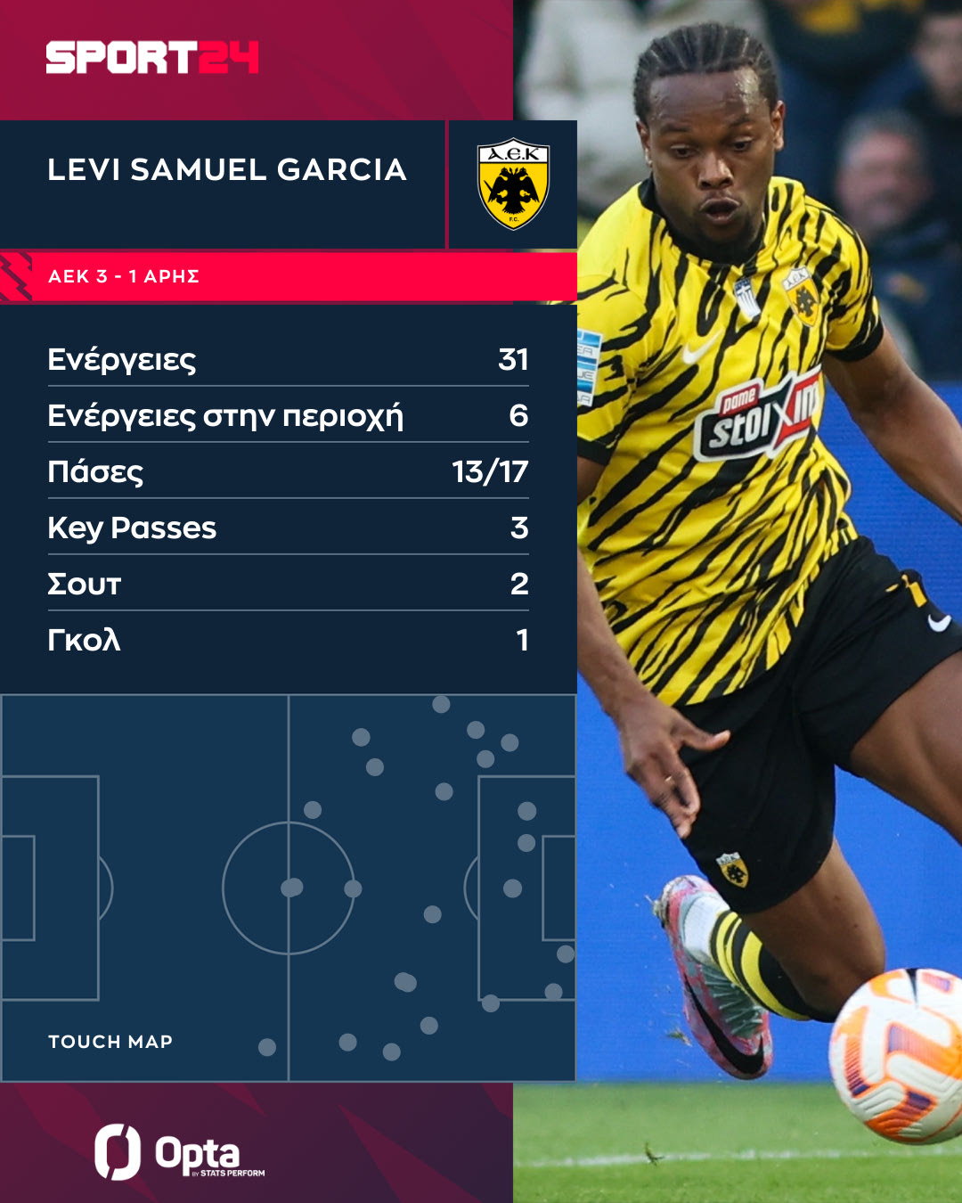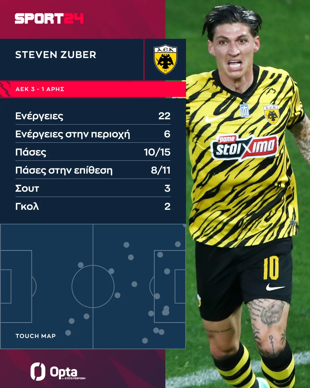 Ο Ελβετός εκμεταλλεύτηκε το μομέντουμ αυτό το οποίο ήταν υπέρ της ΑΕΚ στην προσπάθειά της να βρει τα γκολ της νίκης και πήρε αρκετά την μπάλα στα πόδια του. Συνολικά είχε 22 ενέργειες με την μπάλα, φτάνοντας ακόμα και πιο πίσω από τη μεσαία γραμμή, όπως φαίνεται στο γράφημα της Opta.
