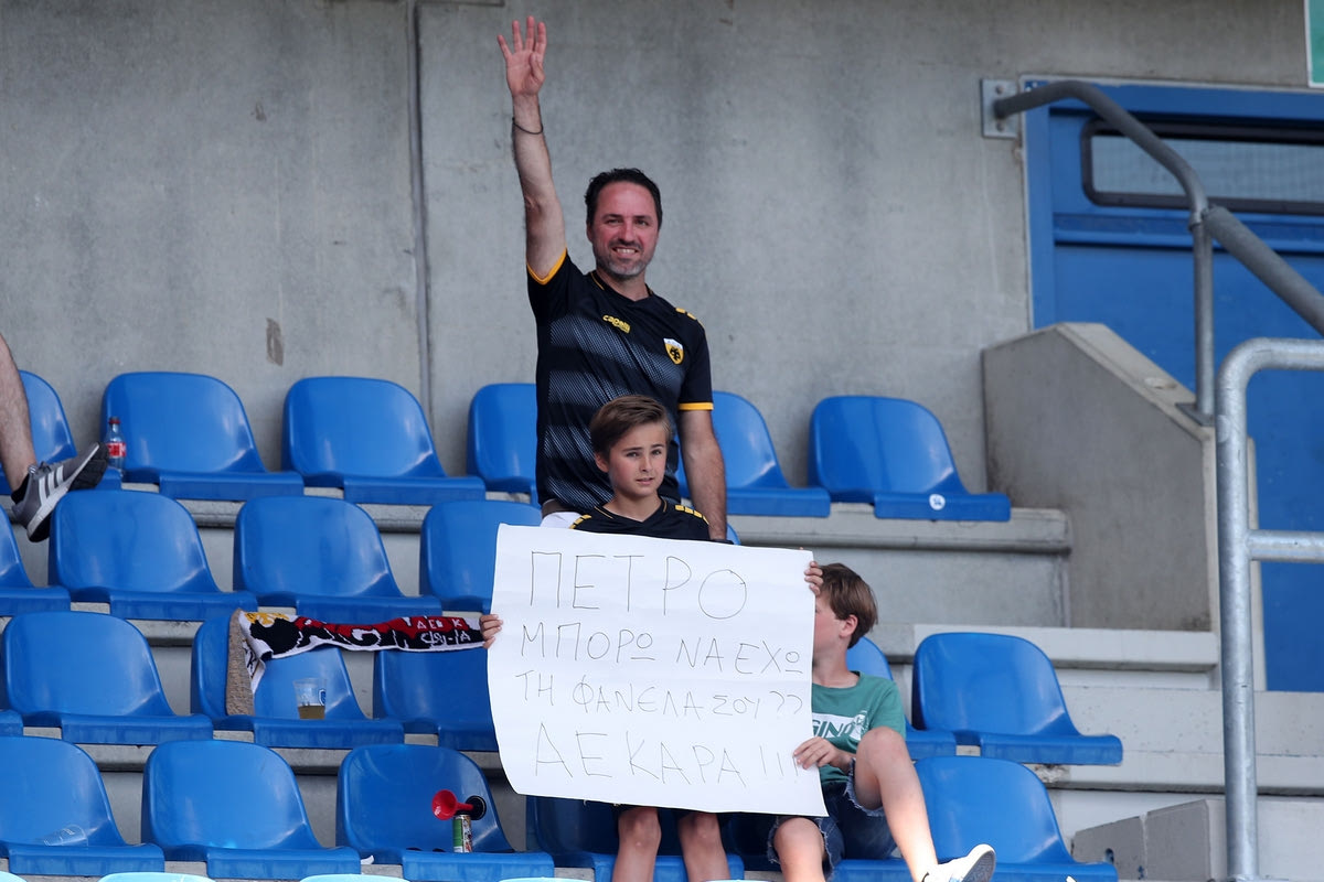 “Πέτρο, μπορώ να έχω τη φανέλα σου; ΑΕΚΑΡΑ”, έγραψε ο πιτσιρικάς στο χαρτόνι.
