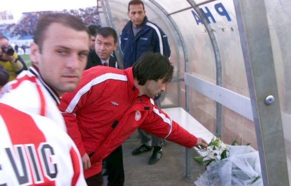 Ιεροκλής Στολτίδης και Βλάνταν Μιλόγεβιτς τιμούν τη μνήμη του Γιόβαν στο ματς με την ΑΕΚ (13/1/2002)