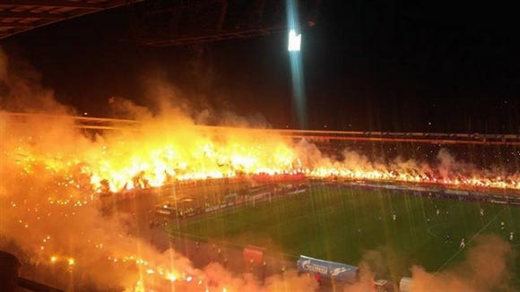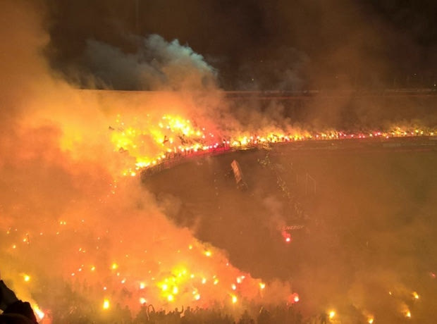 Μάλιστα, όταν ο Αλεκσάνταρ Κατάι (πρώην του Ολυμπιακού) έδωσε ξανά το προβάδισμα στην ομάδα του στο 70ο λεπτό, το γήπεδο πήρε… φωτιά από τους πυρσούς και τις φωτοβολίδες που άναψαν. Για την ιστορία το ματς τελείωσε με 3-1 (το γκολ ο Ούγκο Βιέρα).