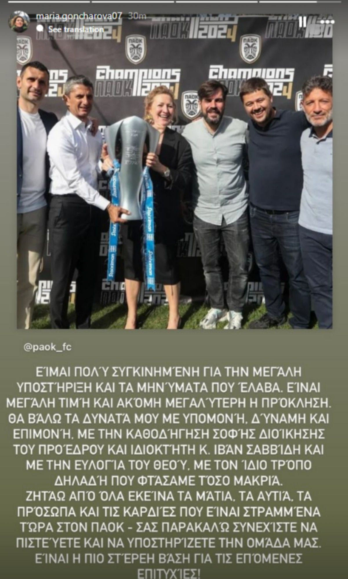 Η Μαρία Γκοντσάρεβα λίγες ώρες μετά την τοποθέτηση της στο ρόλο της CEO στην ΠΑΕ ΠΑΟΚ μέσω μιας ανάρτησης της στο λογαριασμό της στο instagram έστειλε το πρώτο της μήνυμα και ζήτησε συσπείρωση απ’ όλο τον κόσμο της ομάδας για να έρθουν και νέες επιτυχίες.