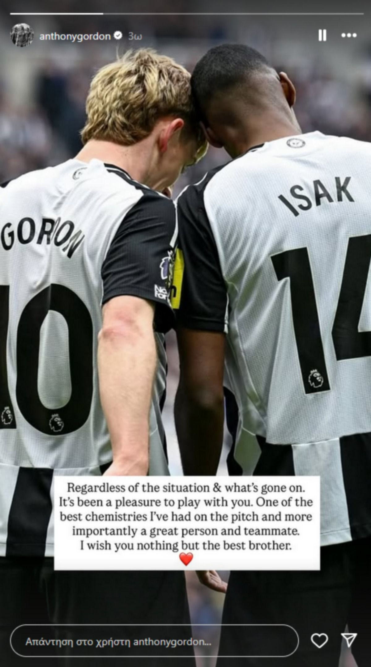 Αυτός ήταν ο Άντονι Γκόρντον, με τον Άγγλο διεθνή μεσοεπιθετικό να μην επηρεάζεται από την βεντέτα που άνοιξε μεταξύ Νιούκαστλ-Λίβερπουλ για τον παίκτη και να μιλάει με τα καλύτερα λόγια για τον μέχρι πρότινος συνοδοιπόρο του μέσω ανάρτησής του στο Instagram.