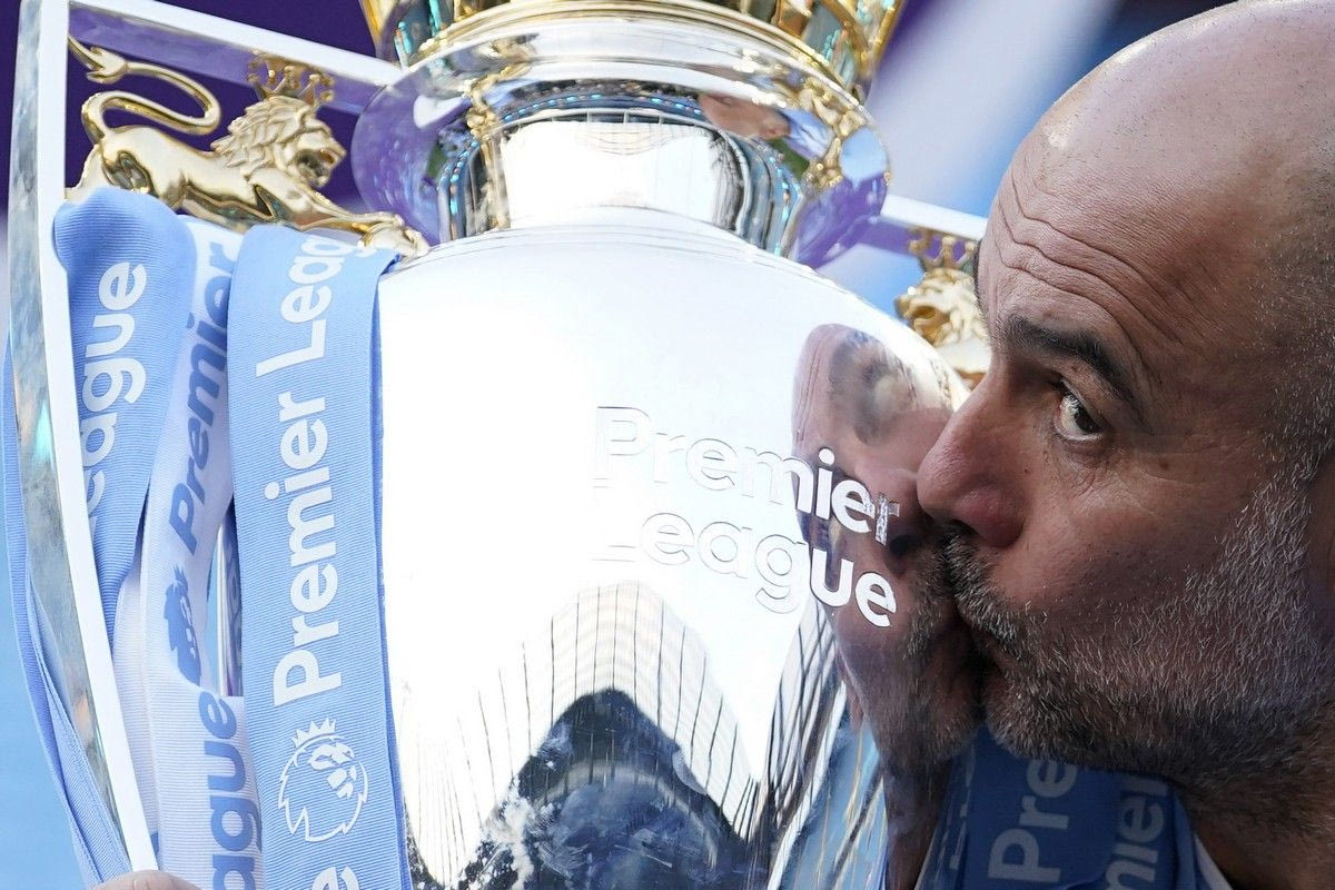 Ο Πεπ Γκουαρδιόλα φιλάει το τρόπαιο της Premier League που κατέκτησε η Σίτι μετά από τη νίκη επί της Γουέστ Χαμ που την έστεψε πρωταθλήτρια Αγγλίας για τέταρτη διαδοχική σεζόν | 19 Μαΐου 2024 @2024 Dave Thompson/AP IMAGES
