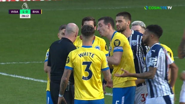 Τότε ήρθε η ώρα να διαμαρτυρηθούν οι παίκτες της Γουέστ Μπρομ προς τον διαιτητή της αναμέτρησης. Το VAR εξακολούθησε να ελέγχει τη φάση και μετά από δύο λεπτά ο ίδιος ο διαιτητής πήγε να δει το βίντεο. Και τελικά πήρε ξανά πίσω την απόφαση του και έδωσε επανάληψη του φάουλ για την Μπράιτον.