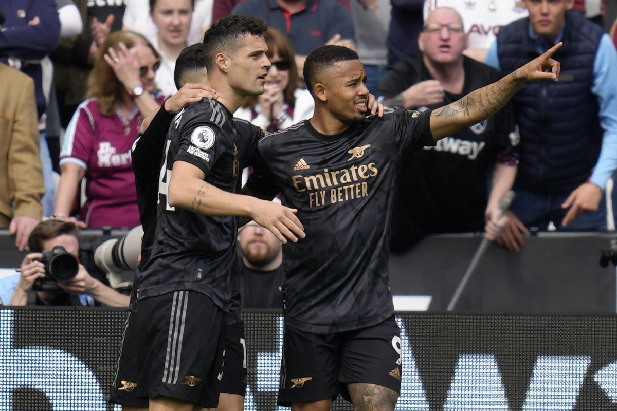 Οι παίκτες της Άρσεναλ πανηγυρίζουν γκολ του Γκαμπριέλ Ζεσούς απέναντι στην Γουέστ Χαμ | 16 Απριλίου 2023 @2023 Kirsty Wigglesworth/AP IMAGES