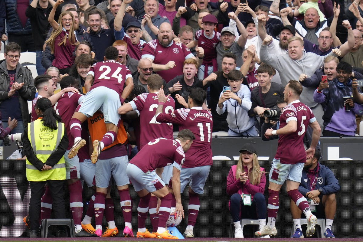 Οι παίκτες της Γουέστ Χαμ πανηγυρίζουν γκολ κόντρα στην Άρσεναλ για την Premier League | 16 Απριλίου 2023 @2023 Kirsty Wigglesworth/AP IMAGES