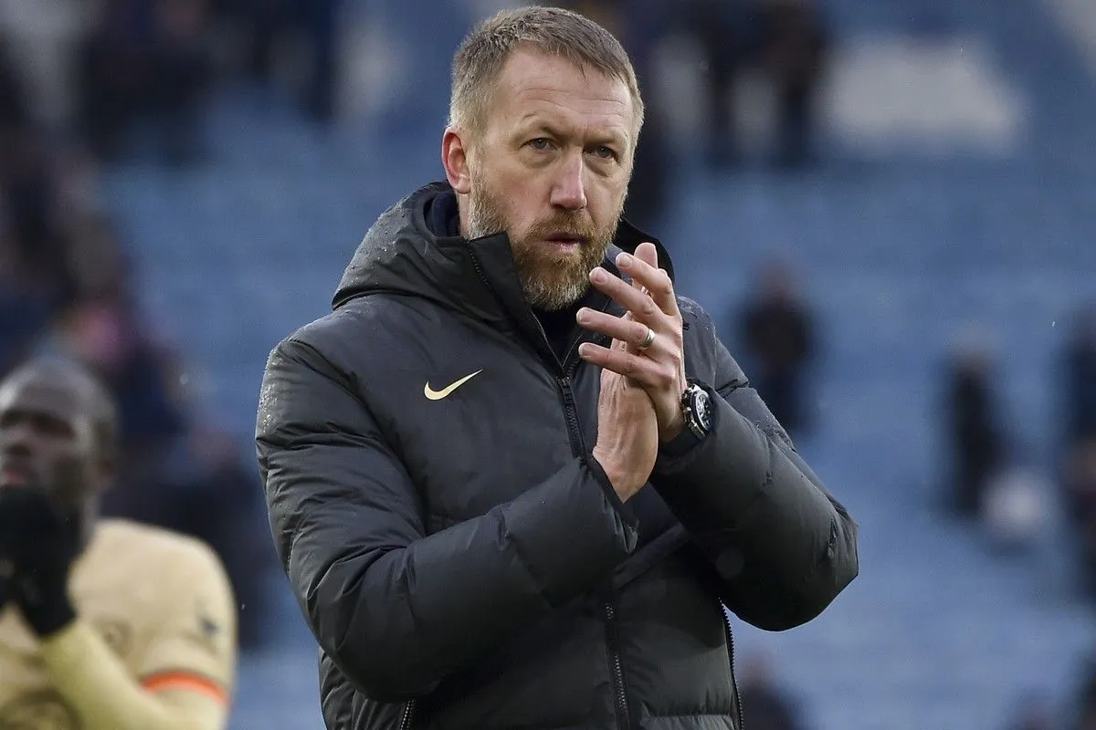 FILE - Chelsea's head coach Graham Potter celebrates at the end of the English Premier League soccer match between Leicester City and Chelsea at King Power stadium in Leicester, England, Saturday, March 11, 2023. Chelsea has fired manager Graham Potter with the club languishing in the middle of the Premier League standings despite spending more than $600 million on players in the last two transfer windows. The team announced Potter's departure on Sunday, April 2. (AP Photo/Rui Vieira, file) @2024 Rui Vieira/AP IMAGES