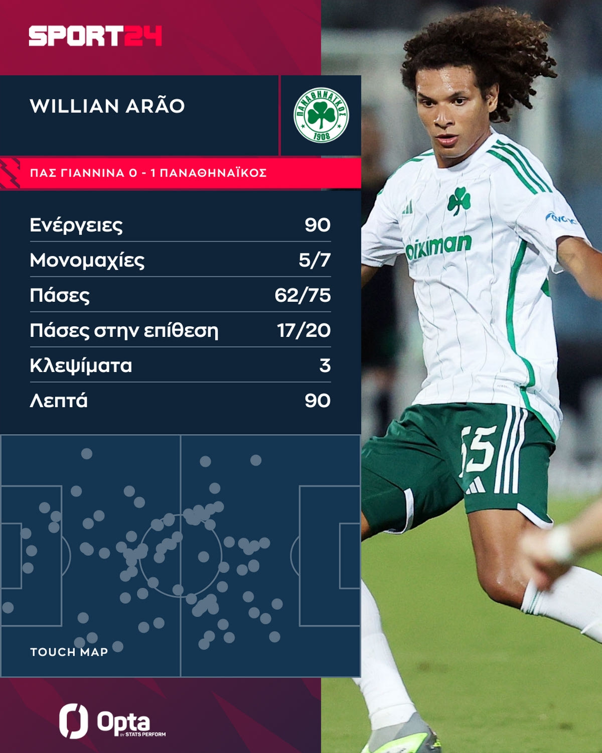 Μπορεί ο Αργεντινός μεσοεπιθετικός να ήταν ο μεγάλος πρωταγωνιστής χάρη στο γκολ, αλλά τη διαφορά απέναντι στον ΠΑΣ την έκανε δίχως αμφιβολία ο Γουίλιαν Αράο. Ο Βραζιλιάνος χαφ αγωνίστηκε βασικός για πρώτη φορά και κατάφερε να παρουσιάσει πολλά απ’ τα αγωνιστικά στοιχεία που τον κάνουν πολύτιμο στο πλάνο του Γιοβάνοβιτς.