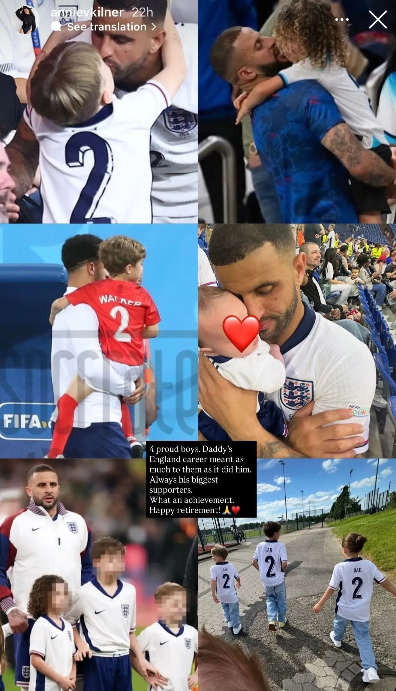 Ο Κάιλ Γουόκερ αποχαιρέτησε την εθνική Αγγλίας και η σύζυγός του, Άνι Κίλνερ, θέλησε να τιμήσει τη στιγμή με ένα συγκινητικό μήνυμα στο Instagram, δημοσιεύοντας φωτογραφίες του ποδοσφαιριστή με τα παιδιά τους.