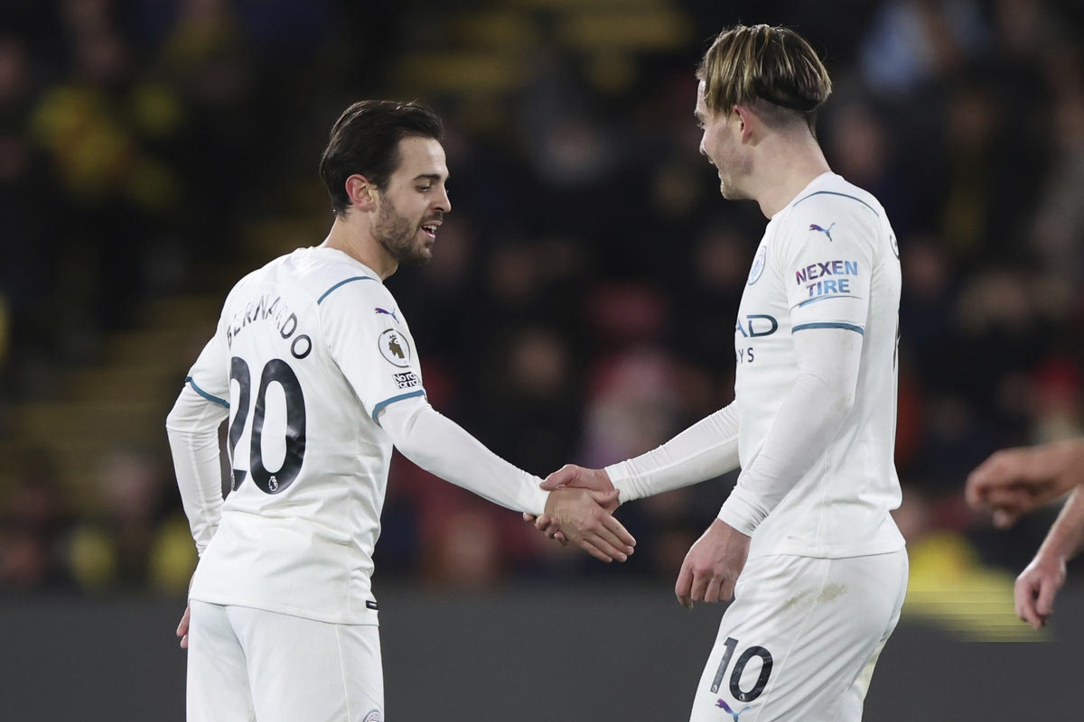 Οι Μπερνάρντο Σίλβα και Τζακ Γκρίλις πανηγυρίζουν γκολ της Μάντσεστερ Σίτι κόντρα στην Γουότφορντ | 4 Δεκεμβρίου 2021 @2021 Ian Walton/AP IMAGES