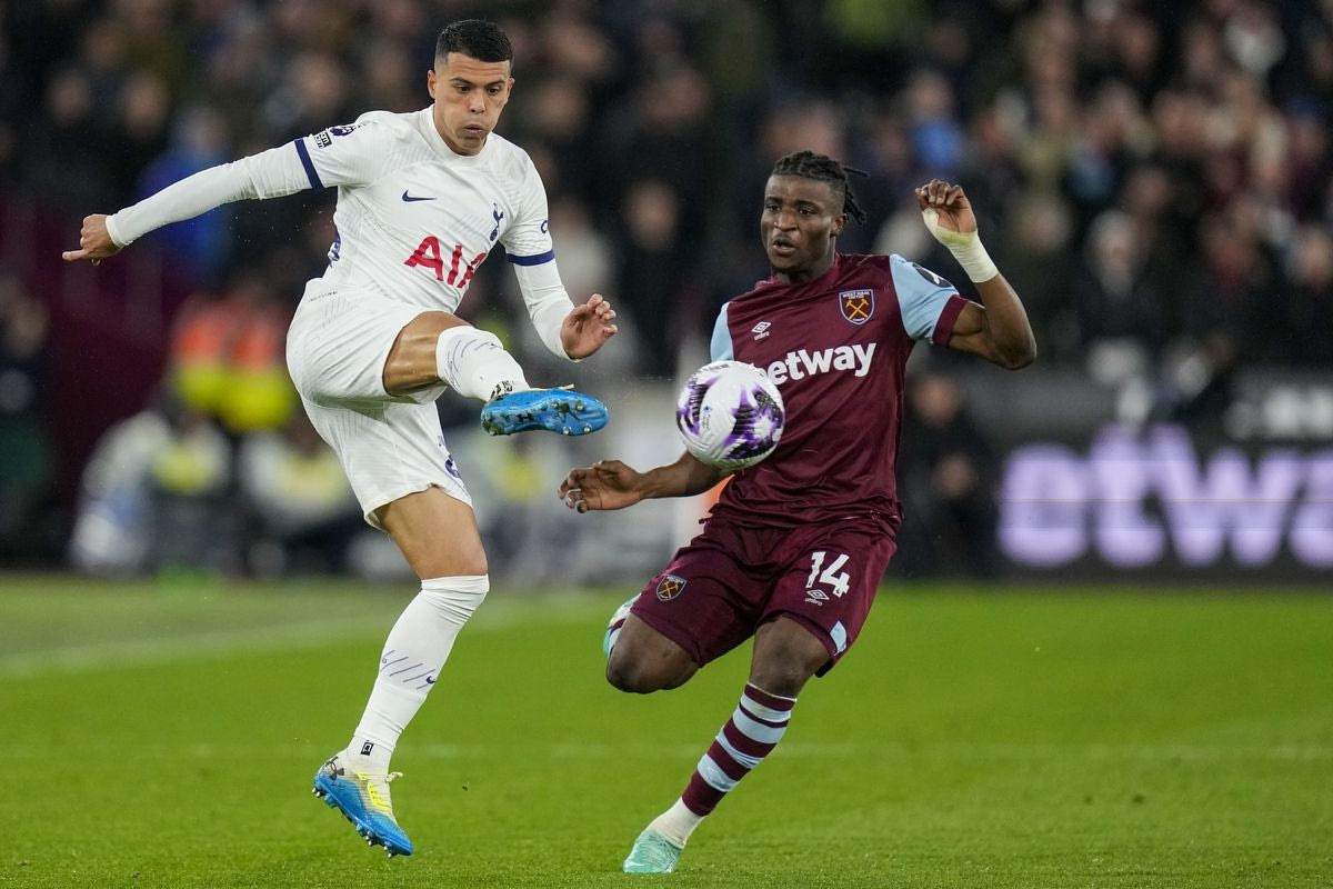 Tottenham's Pedro Porro, left, duels for the ball with West Ham's Mohammed Kudus during the English Premier League soccer match between West Ham and Tottenham, at the London stadium in London, Tuesday, April 2, 2024. (AP Photo/Kirsty Wigglesworth)