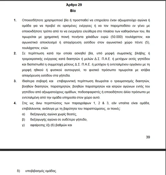 Ο ποδοσφαιρικός εισαγγελέας, Κωνσταντίνος Σιμιτζόγλου, ο οποίος εξέτασε τους φακέλους με τις καταθέσεις, αποφάσισε να ασκήσει την πειθαρχική δίωξη και σύμφωνα (και) με το άρθρο 29 του ΚΑΠ “περί βίας”. Σκοπός είναι να χυθεί φως στην υπόθεση, να ακουστούν όλες οι απόψεις και να αποφανθούν τα αρμόδια όργανα.