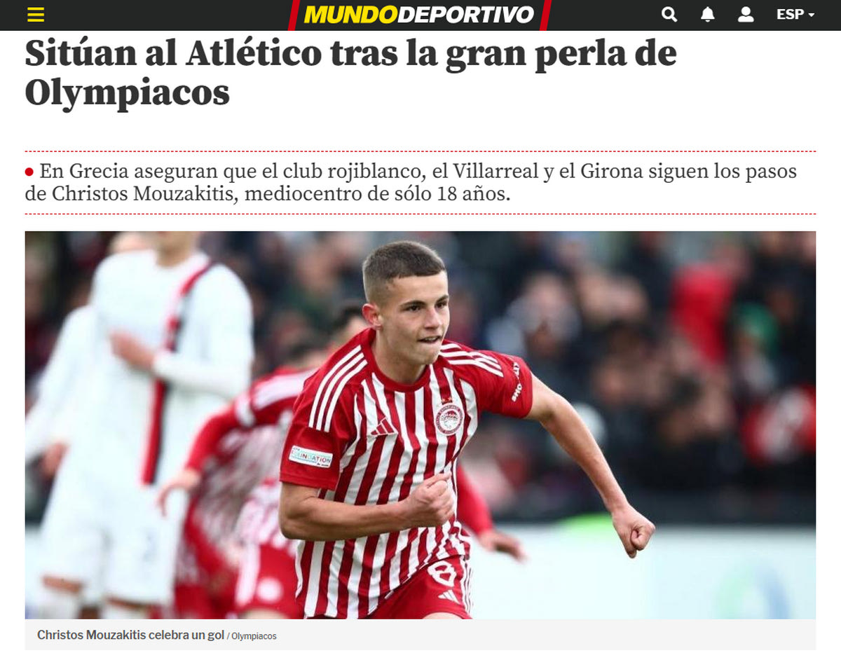 H Mundo Deportivo επικαλείται το ρεπορτάζ του SPORT24 για Μουζακίτη: “Η Ατλέτικο στο κυνήγι του μεγάλου διαμαντιού του Ολυμπιακού”
