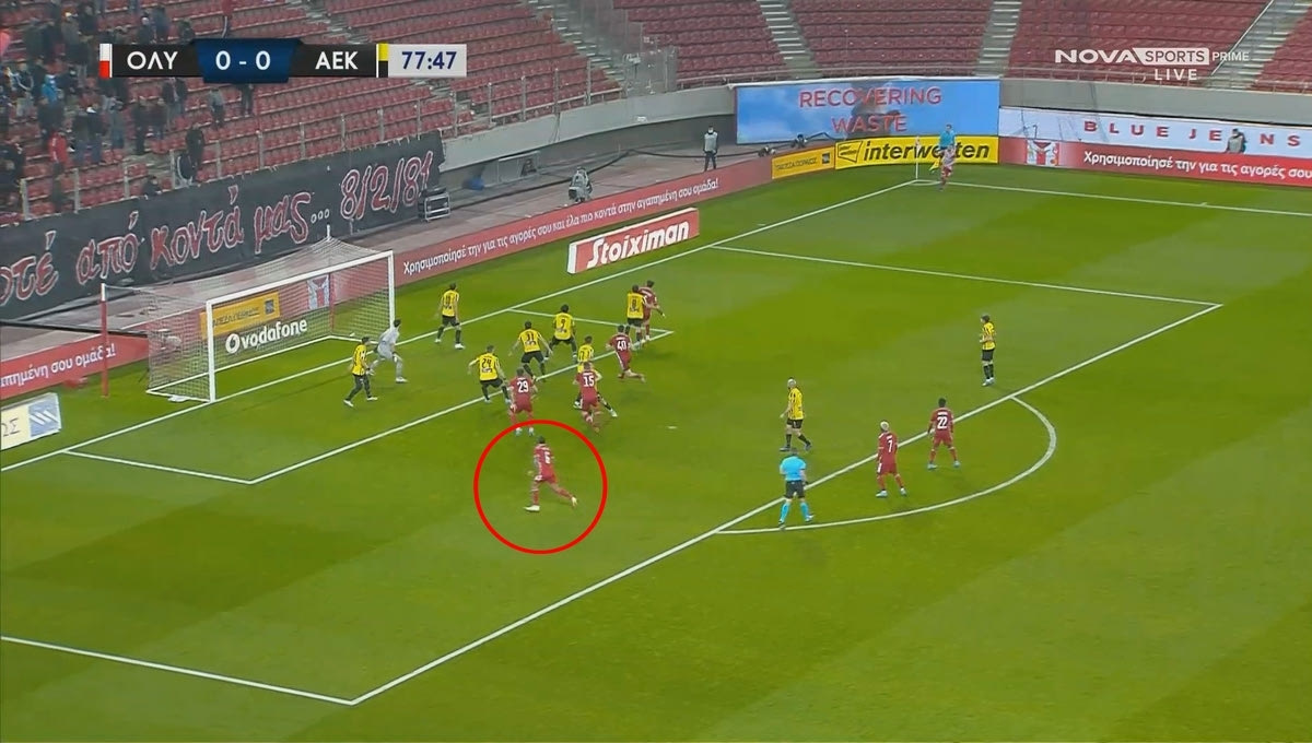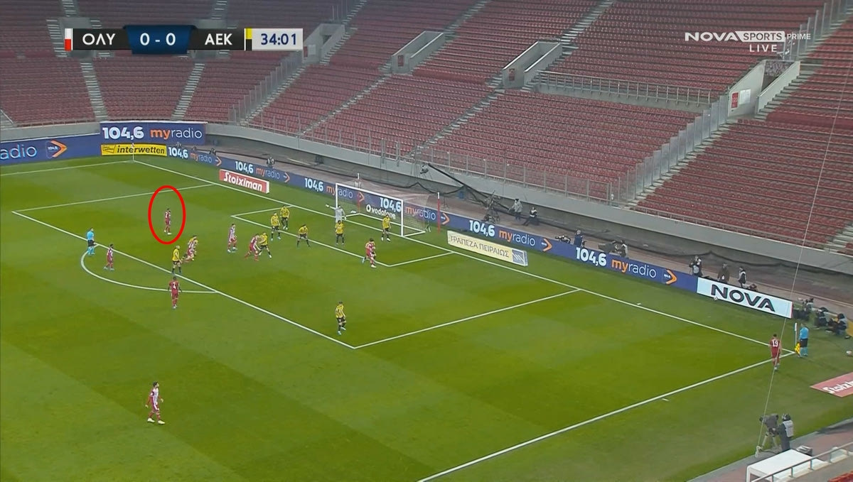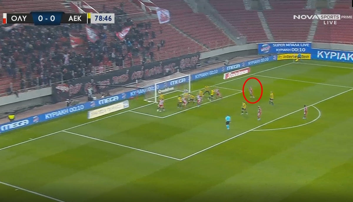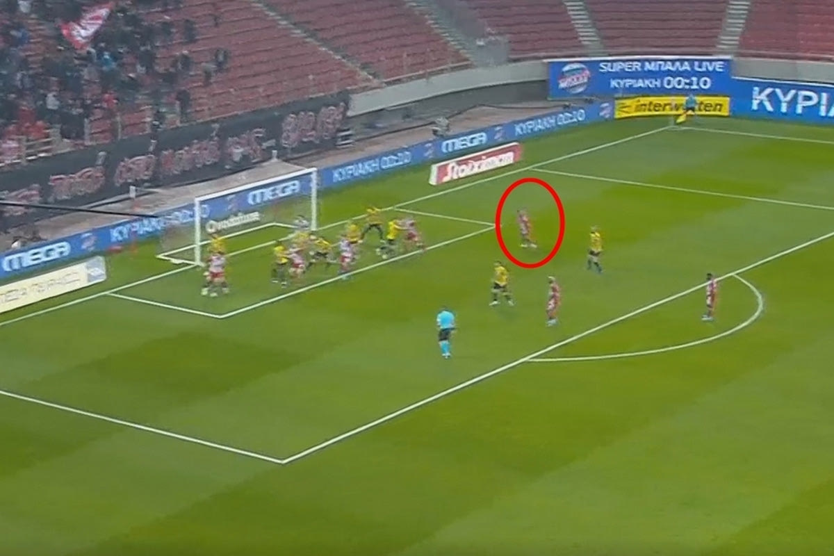 Το πρώτο… καμπανάκι ήχησε στο 35ο λεπτό. Ο Γιώργος Μασούρας εκτέλεσε το κόρνερ από τα δεξιά και όπως είναι εμφανές στο παρακάτω στιγμιότυπο, ο Εμβιλά κινήθηκε αθόρυβα μέσα στη μεγάλη περιοχή.