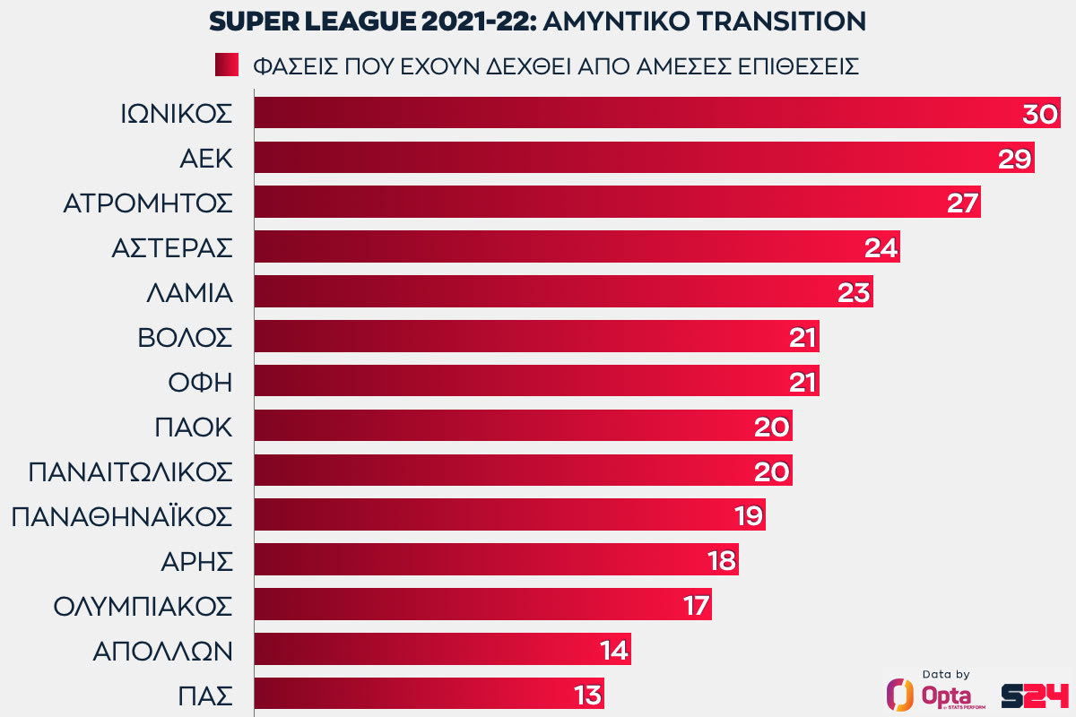 Η ΑΕΚ έχει δεχθεί 29 φάσεις από άμεσες επιθέσεις σ’αυτά τα 15 παιχνίδια του πρωταθλήματος μέχρι σήμερα. Μόνο ο Ιωνικός που ανέβηκε μετά από 14 χρόνια έχει πάει χειρότερα, που έχει δεχθεί μία παραπάνω.