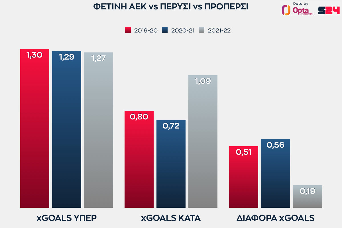 Βελτίωση; Ποια βελτίωση; Στην επίθεση η ΑΕΚ μπορεί να έχει καλύτερους παίκτες, αλλά στην ουσία είναι σταθερά στα ίδια. Από 1.30 του 2019-20, στο 1.29 πέρυσι, στο 1.27 φέτος.