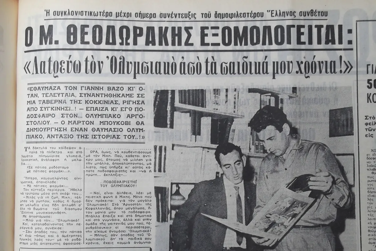 Ο Μίκης Θεοδωράκης είχε παραχωρήσει συνέντευξη στην εφημερίδα “ΦΩΣ” και στον δημοσιογράφο, Άρη Μελισσινό, η οποία δημοσιεύτηκε στις 22 Αυγούστου 1960. Εκεί είχε εξομολογηθεί: “Λατρεύω τον Ολυμπιακό από τα παιδικά μου χρόνια” και πως “Εθαύμαζα τον Γιάννη Βάζο και όταν, τελευταία, συναντηθήκαμε σε μια ταβέρνα της Κοκκινιάς, ρίγησα από συγκίνησι. Έπαιζα και εγώ ποδόσφαιρο, στον… Ολυμπιακό Αργοστολίου – Ο Μάρτον Μπούκοβι θα δημιουργήση έναν θαυμάσιο Ολυμπιακό, αντάξιο της ιστορίας του!”.