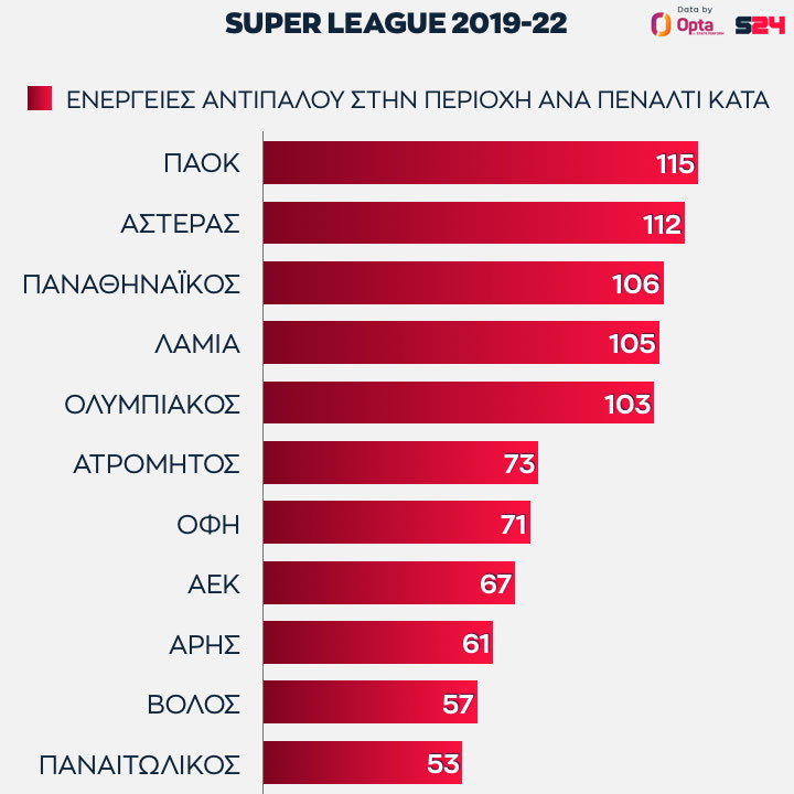 Ο Άρης παίρνει ένα πέναλτι κάθε 78 ενέργειες και ο Ολυμπιακός κάθε 83. Από τις 11 ομάδες που έχουν παίξει και στις τρεις σεζόν, η ΑΕΚ είναι η ομάδα που χρειάζεται τις περισσότερες επαφές για να πάρει πέναλτι, με 95.