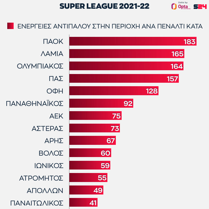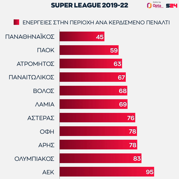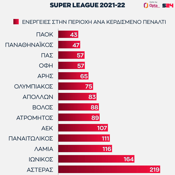 Πρώτος ο Παναθηναϊκός. Οι πράσινοι έχουν πάρει ένα πέναλτι κάθε 45 ενέργειες με την μπάλα στην αντίπαλη περιοχή, η μόνη ομάδα που χρειάζεται λιγότερες από 50 επαφές για να πάει στη βούλα.