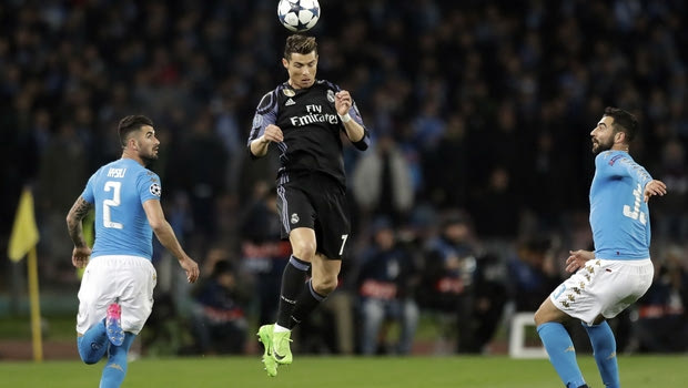 Real Madrid's Cristiano Ronaldo, center, jumps for the ball during the Champions League round of 16, second leg, soccer match between Napoli and Real Madrid at the San Paolo stadium in Naples, Italy, Tuesday March 7, 2017. (AP Photo/Andrew Medichini)