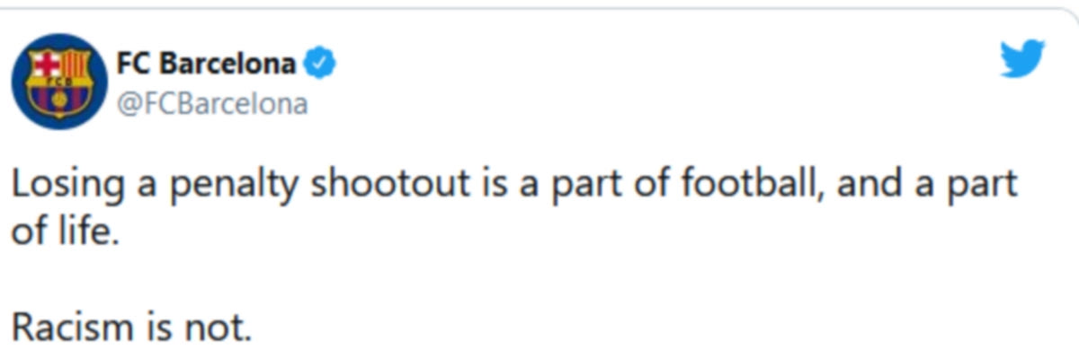 H Μπαρτσελόνα θέλησε να συμπαρασταθεί στους τρεις ποδοσφαιριστές γι’ αυτό κι έστειλε το δικό της μήνυμα: “Το να χάνεις πέναλτι είναι μέρος της ζωής. Ο ρατσισμός, όχι“, ανέφερε στο μήνυμά της.