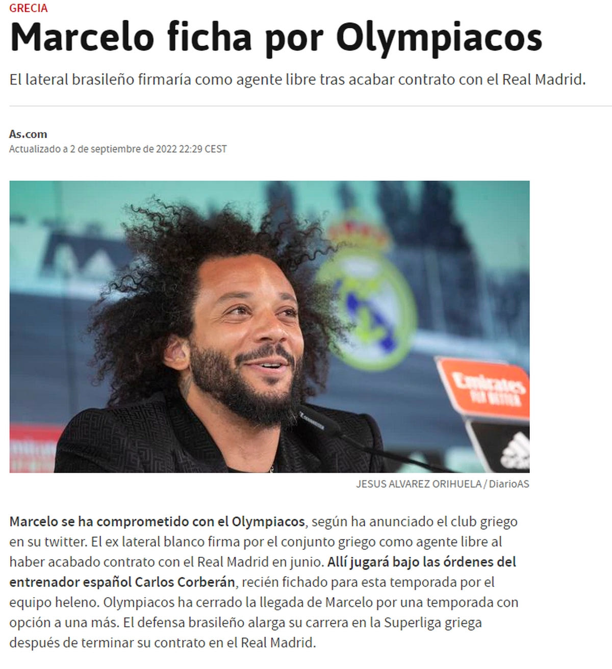 Η AS από την πλευρά της αναφέρει στο κεντρικό της θέμα: “Ο Μαρσέλο υπέγραψε στον Ολυμπιακό”, με την Mundo Deportivo γράφει: “Ο Μαρσέλο βρήκε ομάδα 82 μέρες μετά το αντίο”.