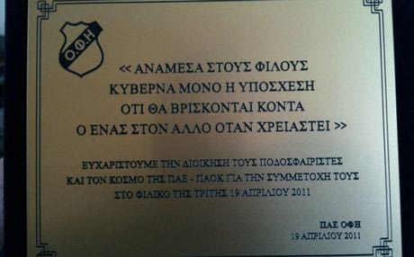Στα πλαίσια του φιλικού, η ΠΑΕ ΟΦΗ είχε εκφράσει και εμπράκτως την ευγνωμοσύνη της στην ΠΑΕ ΠΑΟΚ, απονέμοντας στους ανθρώπους του “Δικεφάλου” μία τιμητική πλακέτα.