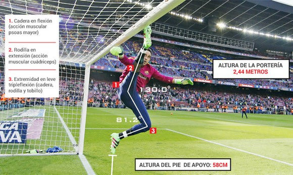 Σύμφωνα με την Sport και τις μετρήσεις που έκανε, το αριστερό πόδι του Μπράβο ήταν στα 58 εκατοστά πάνω από το έδαφος, την ώρα που το δεξί του πόδι τεντώθηκε στα 2 μέτρα και 44 εκατοστά! Δείτε την εντυπωσιακή φωτογραφία με το πόδι του τερματοφύλακα της Μπαρτσελόνα να ακουμπάει το οριζόντιο δοκάρι και ένα βίντεο με τις καλύτερες επεμβάσεις του στο νικηφόρο παιχνίδι της Μπάρσα.