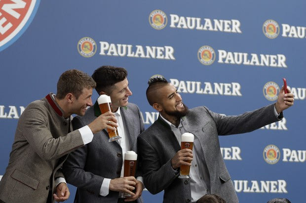 Bayern's Thomas Mueller, from left, Robert Lewandowski and Arturo Vidal make selfies in traditional Bavarian clothes during a photo shooting of a beer brewing company in Munich, Germany, Wednesday, Sept. 13, 2017. (AP Photo/Matthias Schrader)