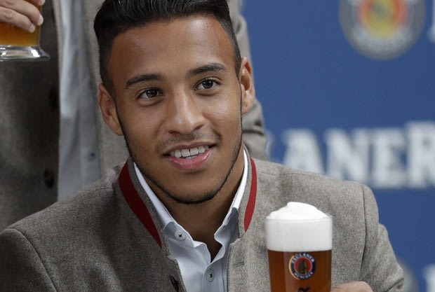Bayern's Corentin Tolisso poses with beer in traditional Bavarian clothes during a photo shooting of a beer brewing company in Munich, Germany, Wednesday, Sept. 13, 2017. (AP Photo/Matthias Schrader)
