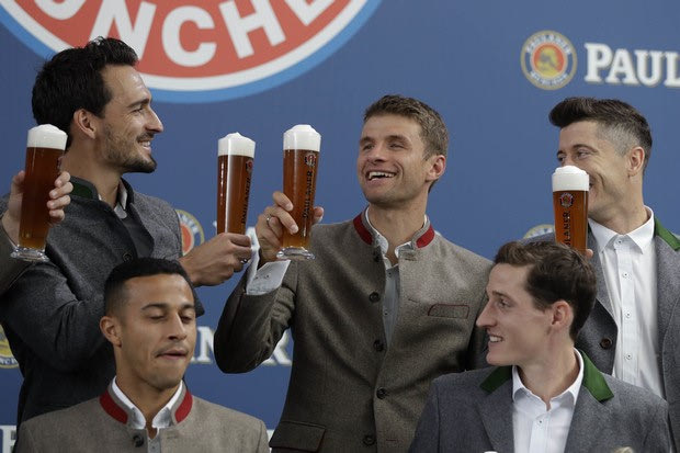 Bayern's players salut with beer in traditional Bavarian clothes during a photo shooting of a brewing company in Munich, Germany, Wednesday, Sept. 13, 2017. Mueller celebrates his 28th birthday today. (AP Photo/Matthias Schrader)
