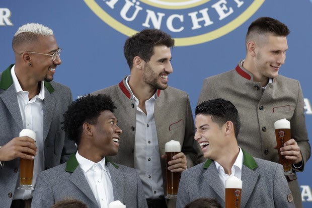 Bayern's James Rodriguez, center, and team mate David Alaba, left, pose in traditional Bavarian clothes during a photo-shooting of a brewing company in Munich, Germany, Wednesday, Sept. 13, 2017. Mueller celebrates his 28th birthday today. (AP Photo/Matthias Schrader)