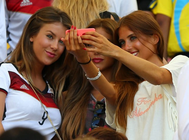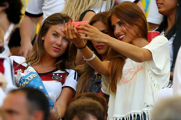 RIO DE JANEIRO, BRAZIL - JULY 04: (L-R) Montana Yorke, girlfriend of Andre Schuerrle of Germany, Ann-Kathrin Brommel, girlfriend of Mario Gotze of Germany, and Cathy Fischer, girlfriend of Mats Hummels of Germany, take a selfie during the 2014 FIFA World Cup Brazil Quarter Final match between France and Germany at Maracana on July 4, 2014 in Rio de Janeiro, Brazil. (Photo by Martin Rose/Getty Images)