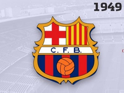 To 1949, η Μπαρσελόνα εκμεταλλεύεται την επέτειο μισού αιώνα ζωής και ξανακάνει τις γραμμές τέσσερις. Το de (γενική κτητική) έπιανε χώρο και προφανώς ενοχλούσε και τα γράμματα βάφονται μπλε.