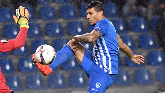Genk's Nikos Karelis, right, moves to score against Sassuolo oalkeeper Andrea Consigli during the Europa League Group stage F soccer match between Genk and Sassuolo at the Cristal Arena in Genk, Belgium, Thursday, Sept. 29, 2016. (AP Photo/Geert Vanden Wijngaert) AP