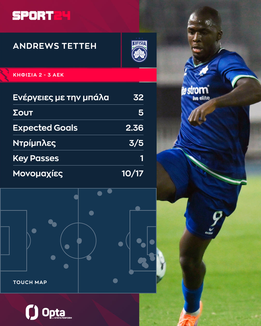 Άλλωστε ο Τεττέη ήταν ο πρώτος σε ενέργειες της Κηφισιάς στο πρώτο μέρος (!) με 19, πράγμα σπάνιο για έναν σέντερ φορ. Συνήθως τις περισσότερες ενέργειες με την μπάλα έχουν οι στόπερ ή κάποιοι παίκτες της αμυντικής γραμμής. Ο 24χρονος φορ ολοκλήρωσε το ματς με 32 ενέργειες τις οποίες μπορείτε να δείτε στο γράφημα της Opta Stats / Perform.