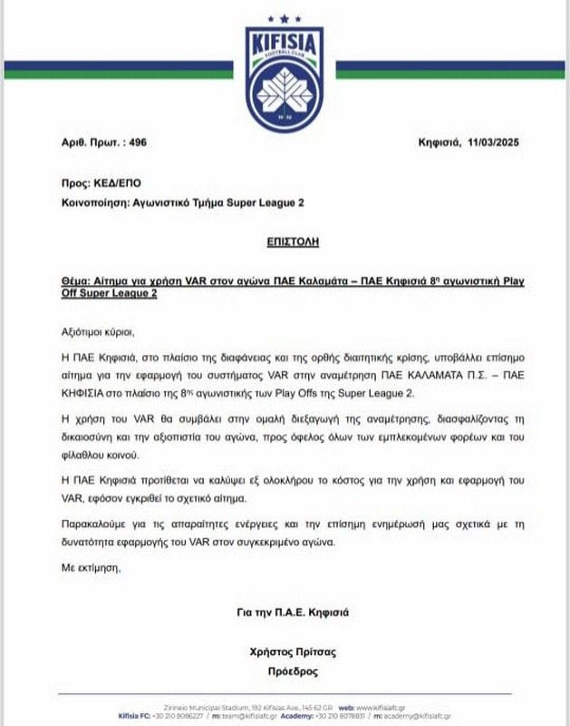 “Η ΠΑΕ Κηφισιά, στο πλαίσιο της διαφάνειας και της ορθής διαιτητικής κρισης, υποβάλλει επίσημο αίτημα για την εφαρμογή του συστήματος VAR στην αναμέτρηση ΠΑΕ ΚΑΛΑΜΑΤΑ ΠΣ – ΠΑΕ Κηφισιά, στο πλαίσιο της 8ης αγωνιστικής των play off της Super League 2.