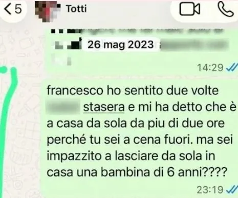 Λίγο πριν τα μεσάνυχτα του έστειλε μήνυμα ζητώντας εξηγήσεις για την απουσία του και στη συνέχεια ζήτησε από τη μητέρα της να καλέσει την αστυνομία. Το μήνυμα που έγινε γνωστό αργότερα έλεγε: “Φραντσέσκο, μίλησα με την κόρη μας δύο φορές απόψε και μου είπε ότι είναι μόνη στο σπίτι για πάνω από δύο ώρες επειδή έχεις βγει για δείπνο. Είσαι τρελός που αφήνεις ένα 6χρονο κορίτσι μόνο;”