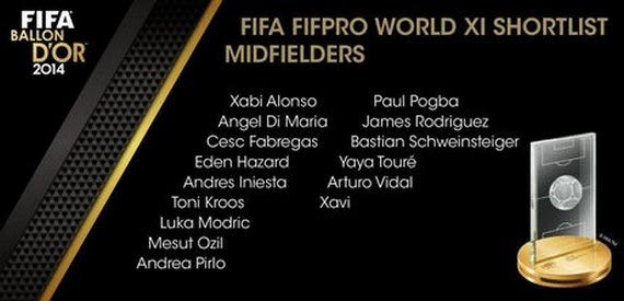 Η Ένωση Επαγγελματιών Ποδοσφαιριστών (FIFPro) ανακοίνωσε τη λίστα των 15 μέσων που διεκδικούν θέση στην κορυφαία ενδεκάδα για το 2014. Εκπλήξεις αλλά και αρκετές απουσίες. Δείτε την λίστα.