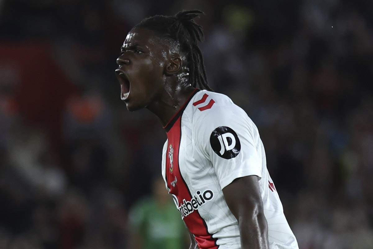 Southampton's Romeo Lavia celebrates after scoring his side's opening goal during the English Premier League soccer match between Southampton and Chelsea at St Mary's Stadium, Southampton, England, Tuesday, Aug. 30, 2022. (AP Photo/Ian Walton)