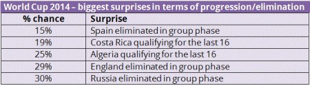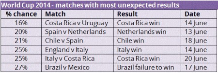 Το ποσοστό της νίκης της Ιταλίας επί της Αγγλίας στην φάση των ομίλων ήταν μόλις 25%. Το ίδιο ποσοστό είχε και η νίκη της Κόστα Ρίκα επί της Ιταλίας. Τέλος, η ισοπαλία της Βραζιλίας με το Μεξικό είχε 27% πιθανότητες να συμβεί.