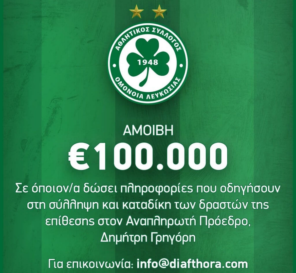 Την αμοιβή των 100.000 ευρώ προσφέρει η Ομόνοια σε όποιον δώσει πληροφορίες που θα βοηθήσουν στη σύλληψη των δραστών της επίθεσης στο σπίτι του αναπληρωτή προέδρου της, Δημήτρη Γρηγόρη. Όπως αναφέρει η ενημέρωση της κυπριακής ομάδας, οποιος γνωρίζει το οτιδήποτε που θα μπορούσε να βοηθήσει να βρεθεί η άκρη του νήματος, μπορεί να επικοινωνήσει με σχετικό email το οποίο τυγχάνει χειρισμού από δικηγόρο.